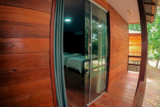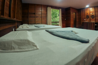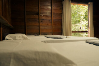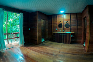 Indulge in luxury at Temensis Hotel, where our private cabanas offer the perfect blend of comfort and tranquility. Each cabana is equipped with a king-size bed, double sinks, a walk-in shower with hot water, air conditioning, and a private balcony overlooking the rainforest.